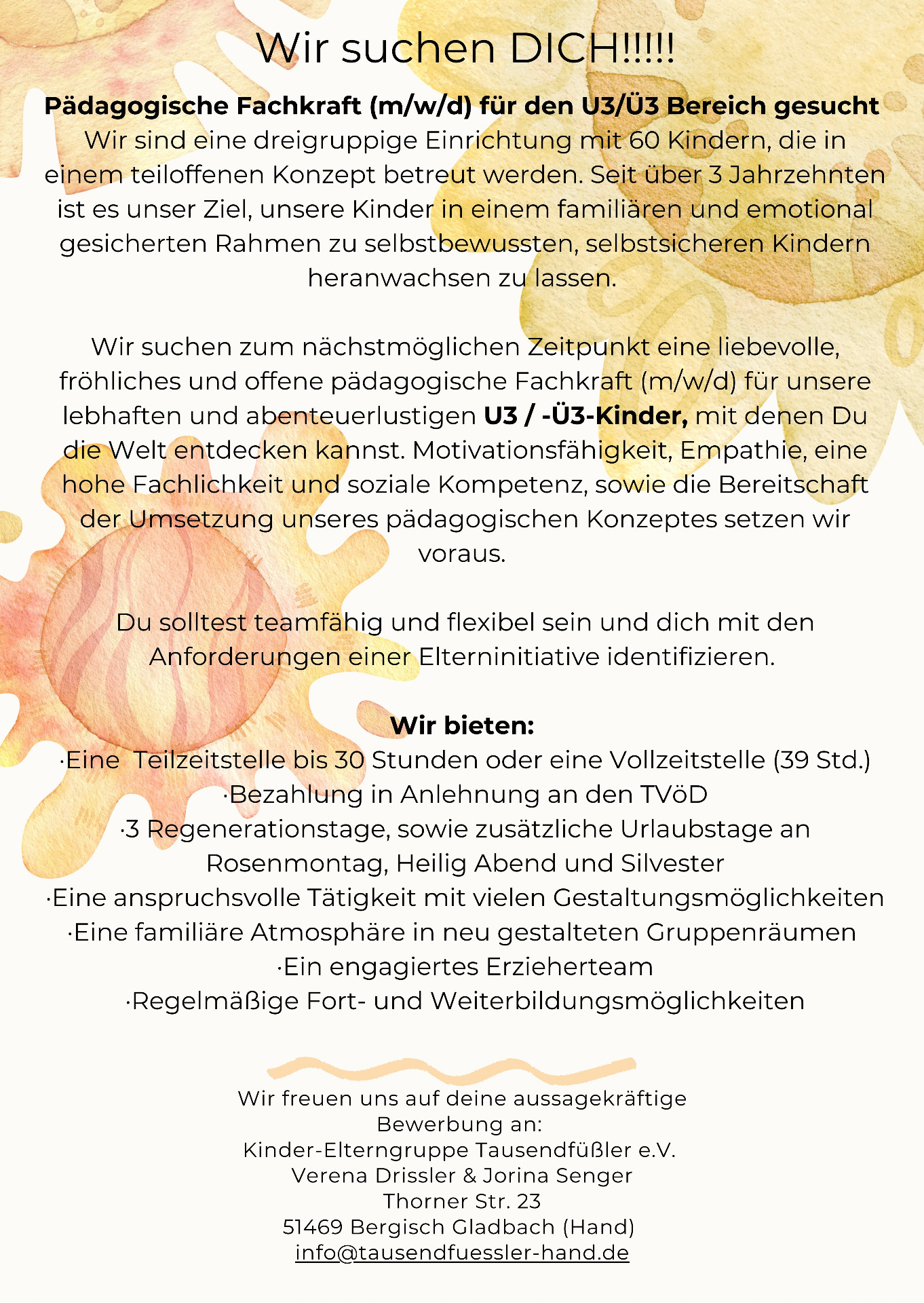Unser Tausendfüssler ist ein Ausbildungsbetrieb für verschiedene Fachrichtungen. Wir begleiten und unterstützen Praktikanten in der Kinderpflege und der Erzieherausbildung (PIA) sowie Studierende im Sozialwesen und Freiwillige, die das soziale Jahr absolvieren. Ebenfalls bieten wir Schülerinnen und Schülern in der Sekundarstufe gerne Orientierungspraktika für die Berufswahl an.